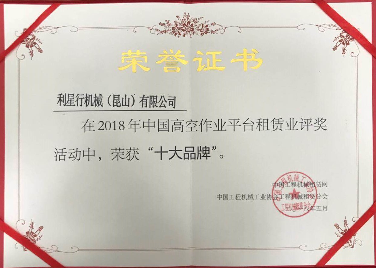 kaiyun开云机械(昆山)有限公司荣获由“中国工程机械租赁网”和“中国工程机械工业协会工程机械租赁分会”联合授予的2018中国高空作业平台租赁业“十大品牌”荣誉称号。